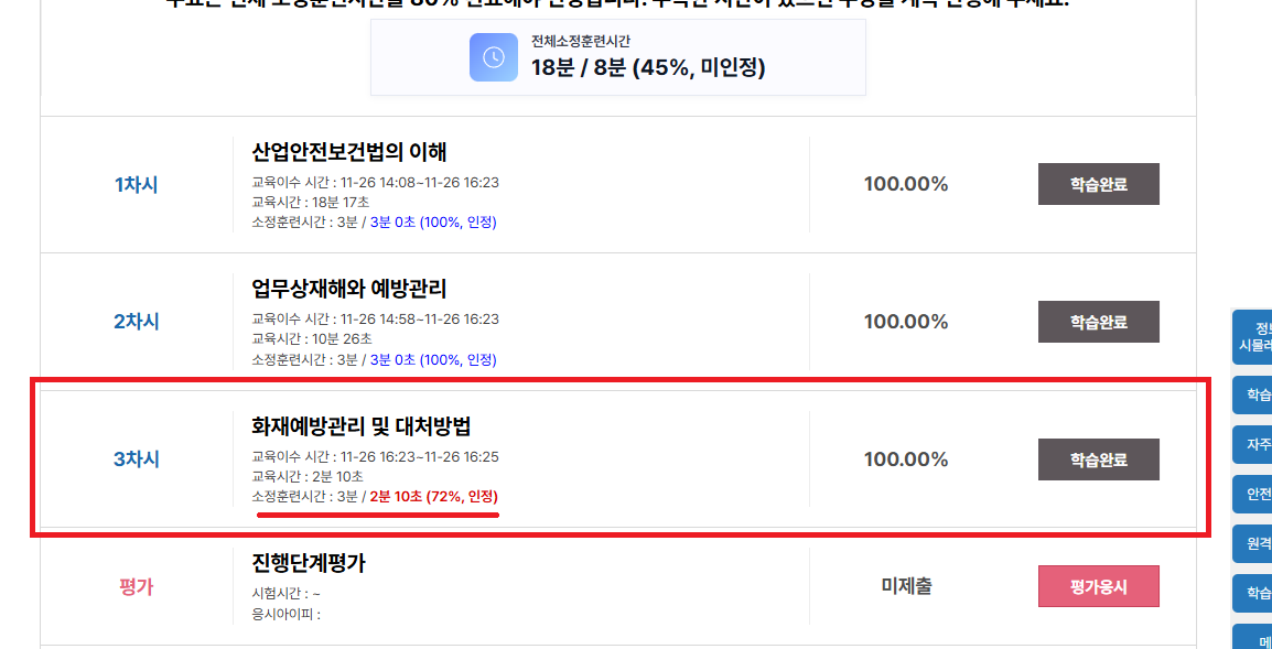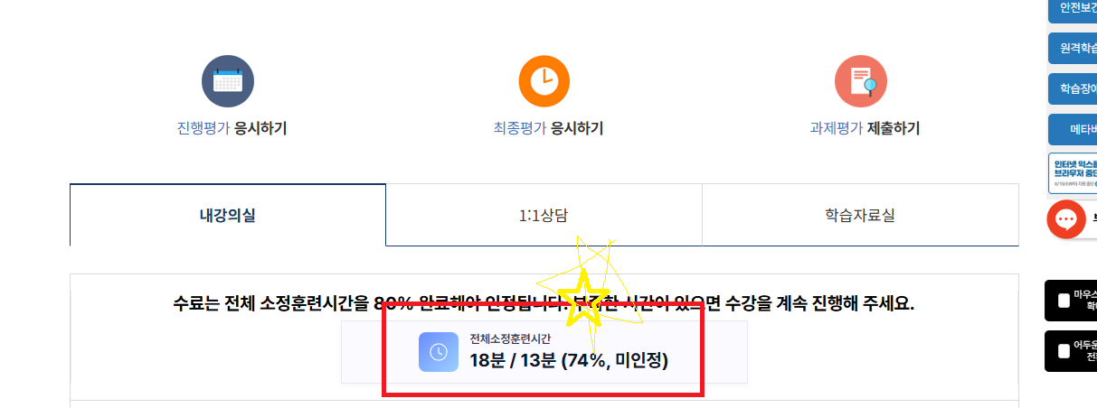 ※ 각 차시별 학습이 100%로 나오더라도 소정시간의 80%를 충족하지 못하면 평가참여가 불가능 합니다.