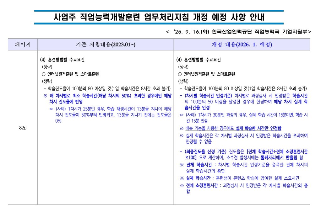 하지만 정책의 변경에 따라 2026.1.1. 부터는 전체 소정시간의 80% 이상을 수강해야만 학습이 인정이 됩니다.
