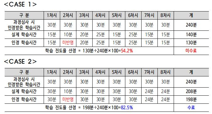 기존 1차시 학습시간이 30분일 경우 15분만 학습해도 학습으로 인정