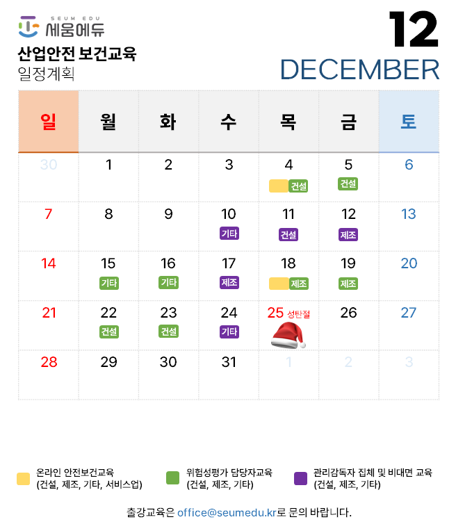 2025년 12월 진행가능한 온라인/집체/비대면 근로자, 관리감독자, 위험성평가 담당자 등 산업안전보건교육 계획을 아래와 같이 안내 합니다. 단, 2025년 6월부터 온라인 근로자정기안전보건교육이 매주 수,목 에서 업무의 효율성을 위해 매월 1,3주차 목요일 개강으로 변경이 됩니다. 참고부탁드립니다. 그 외 위험성평가 담당자교육, 비대면 근로자안전보건교육, 집체 근로자안전보건교육, 우편 관리감독자 교육 일정 등 은 기존 그대로 진행이 됩니다. 현재 12월 중순까지 출강일정이 모두 잡혀서 해당기간에 출강교육을 원하는 기업은 일정조율이 필요 합니다.(※ 특별교육 등 12월말 또는 1월초에 진행이 가능 합니다. 특별교육은 이러닝 교육을 먼저 수강하시고 3개월 이내에 12월말 또는 1월초에 비대면 일정을 잡아서 진행하시는것을 추천 드립니다. 현재는 중순까지 모든 일정이 잡혀 있습니다.) 자세한 문의사항은 1833-3075로 문의주시기 바랍니다. 온라인 산업안전보건교육은 최신(2025.08.기준) 개정안이 적용된 콘텐츠로 제공이 됩니다. 화재폭발대피 교육 및 폭염, 한파 대처법 안전교육 등 최신 규정에 따른 내용이 모두 반영되어 있습니다.