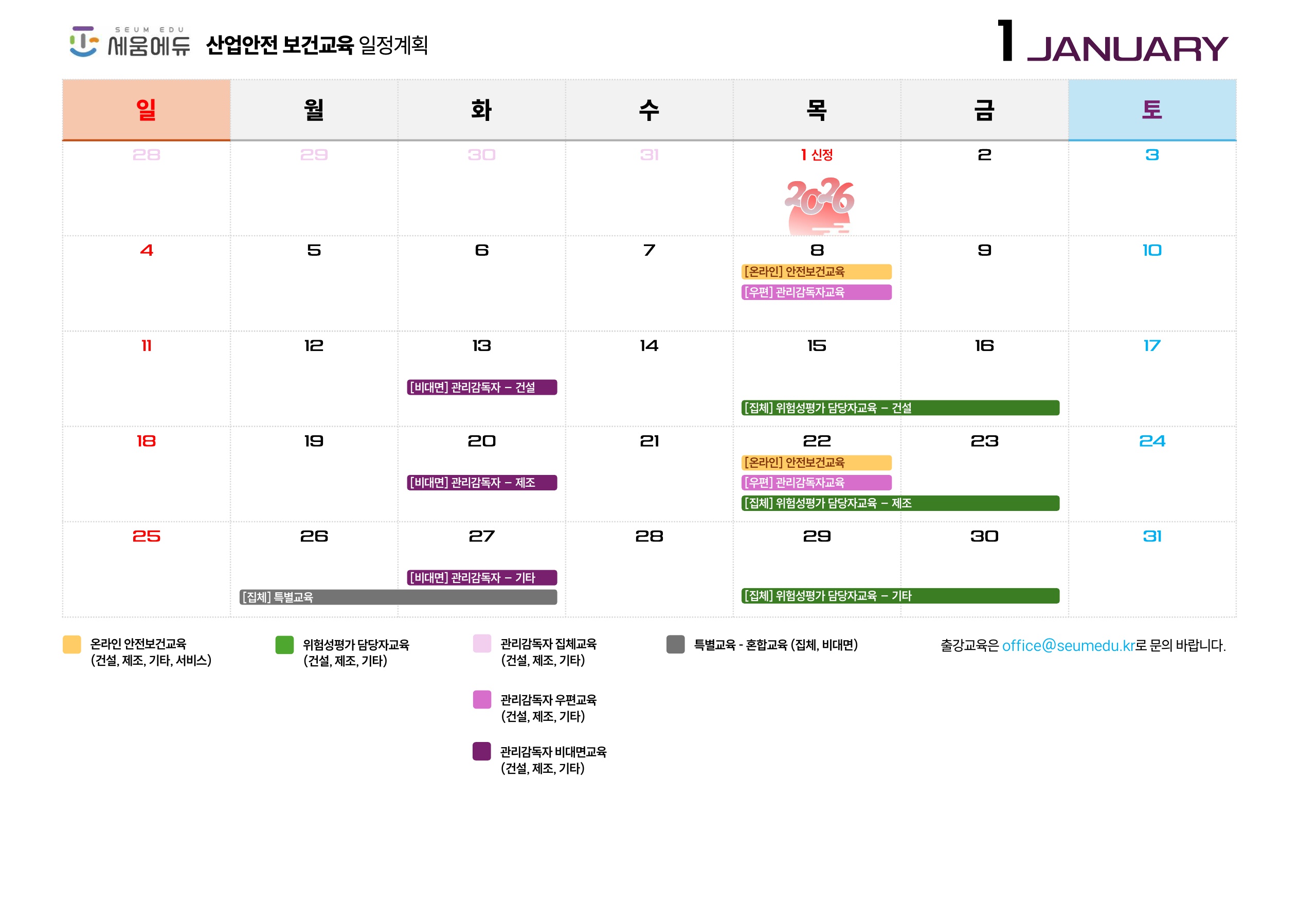 2026년 1월 진행가능한 온라인/집체/비대면 근로자, 관리감독자, 위험성평가 담당자 등 산업안전보건교육 계획을 아래와 같이 안내 합니다. 교육일정은 업체의 사정에 따라 조율이 가능 합니다. 자세한 문의사항은 1833-3075로 문의주시기 바랍니다. 온라인 산업안전보건교육은 최신(2025.12.기준) 개정안이 적용된 콘텐츠로 제공이 됩니다. 화재폭발대피 교육 및 폭염, 한파 대처법 안전교육 등 최신 규정에 따른 내용이 모두 반영되어 있습니다. 세움에듀는 자체 콘텐츠 개발능력을 보유하고 있으며, 최근 개정사항이 반영된 콘텐츠는 26년 2월부터 제공예정 입니다. 또한, 업종별 특화과정이 더 추가되었습니다.